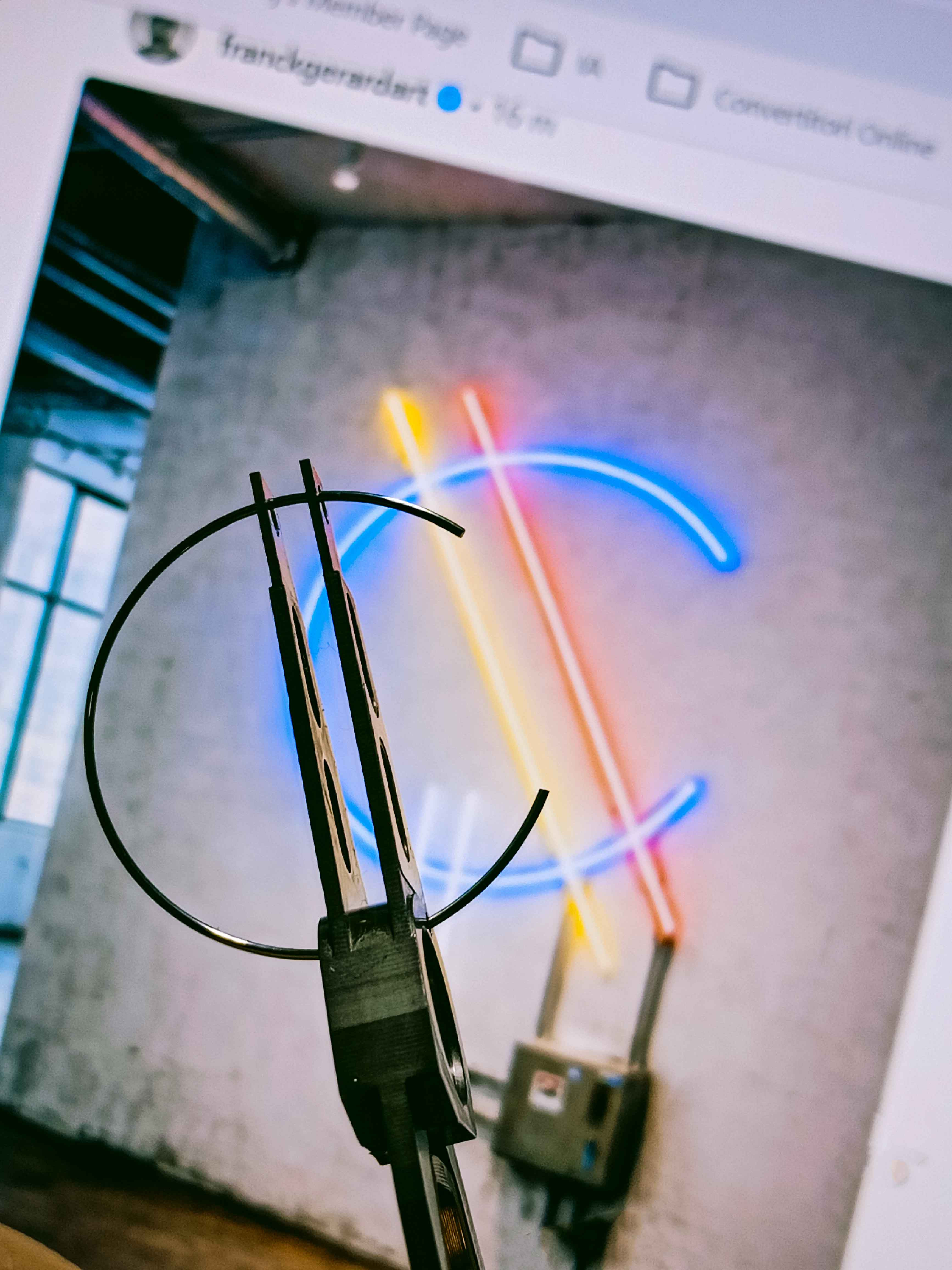 Рис. 1. Рычаг актуатора жёсткого диска, поднесённый к неоновой инсталляции (franckgerardart, Instagram, февраль 2026). Металлическая кривая механизма чтения/записи органа, некогда переводившего невидимые магнитные поля в извлекаемые данные совмещается с внешним источником света, завершая когерентную геометрическую форму между двумя несвязанными объектами. Автор создал скульптурную форму за несколько дней до встречи с неоновой работой. Фотография автора.