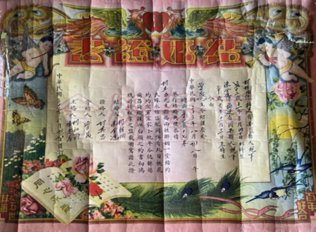 Под британским колониальным правлением с 1819 по 1959 год в Сингапуре поселились мигранты с Китая, Индии, а также Малайского архипелага — малайцы, яванцы, бугисы и балийцы (Saw, 2012). В 1941 году, мой покойный дедушка по отцовской линии мигрировал в Сингапур из Китая, провинции Фуцзянь 福建, уезда Аньси 安溪, широко известного как чайная столица страны, производящая знаменитый чай Тегуаньинь (铁观音tiěguānyīn — Железная богиня милосердия). Будучи старшим сыном, мой тогда восемнадцатилетний дед, стал первым в семье, кто отважился присоединиться к волне ранних китайских мигрантов и перенести опасное путешествие на китайской джонке в Наньян (南洋), ныне известный как Сингапур. Обосновавшись там и зарабатывая скудный доход в качестве «каранг гуни» (разговорное выражение для сборщика утиля, тряпичника), он, скопив достаточно денег на проезд, оплатил и организовал переезд своего отца и сводных братьев по тому же маршруту в Наньян. Путешествие-миграция моего покойного деда ознаменовало начало того, как генеалогическое древо семьи Куа пустило свои ветви в сингапурском обществе. Он и его семья быстро укоренились, работая и налаживая свой жизненный уклад, заключая браки и создавая семьи. В 1945 году мой дедушка женился на моей родившейся в Сингапуре бабушке, представительнице второго поколения китайских иммигрантов, также из провинции Фуцзянь, но из другого уезда — Тунъань 同安 (см. рис. — их свидетельство о браке).