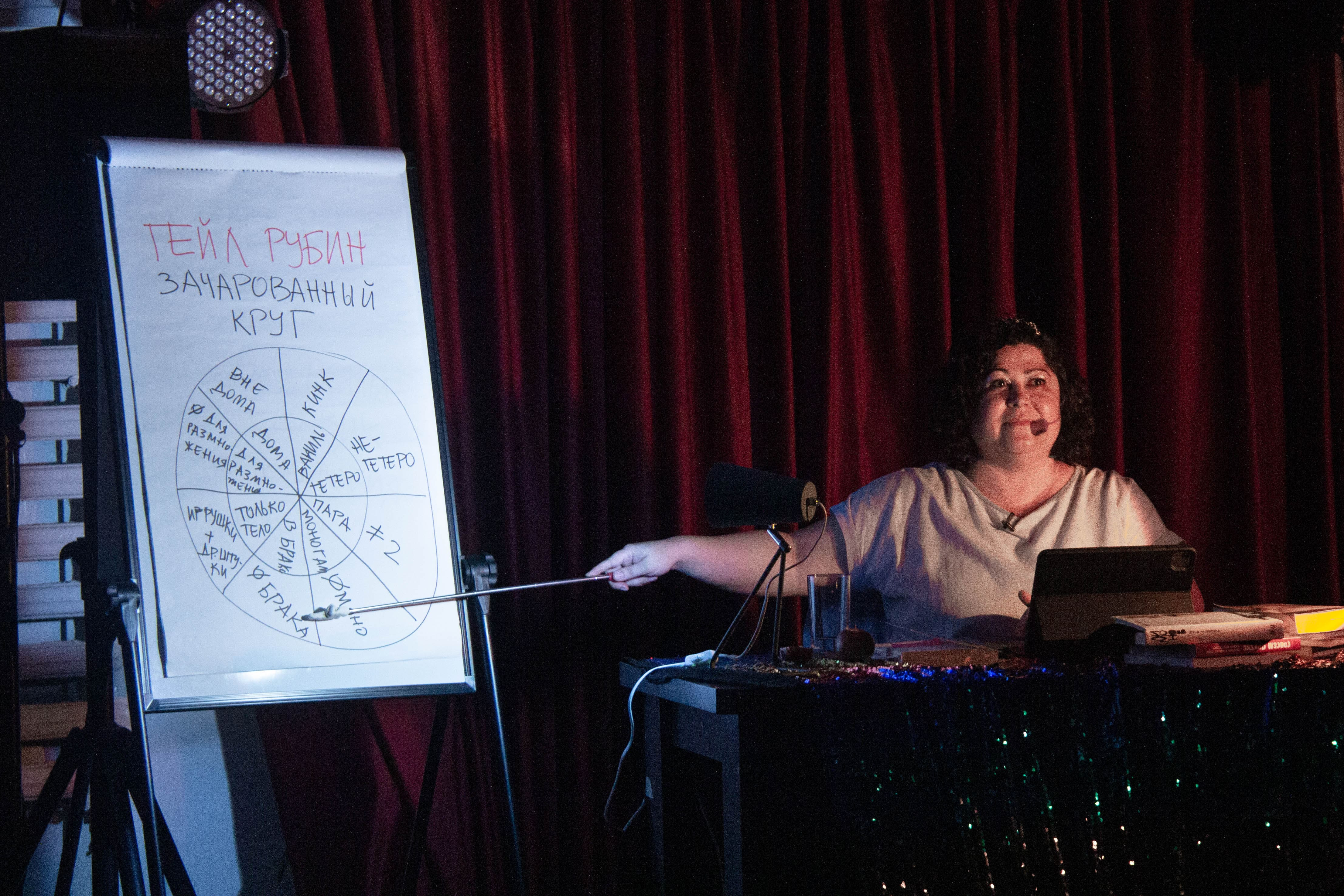 На кабаре-лекции зрители погрузились в волшебную атмосферу драг-перформансов, вога и болрум-культуры, которые вписаны в лекционную часть с элементами стендапа и автофикшена. Зрителям был предложен велкам-дринк, ппшный снэк и пойти нахуй.